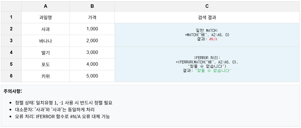 =IFERROR(MATCH("배", B2:B6, 0), "찾을 수 없습니다")