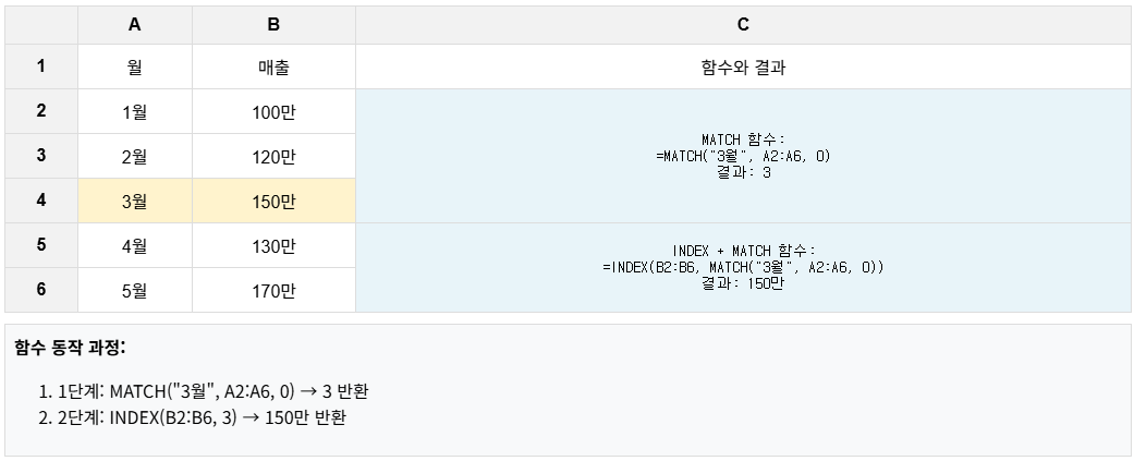 =INDEX(B2:B6, MATCH("3월", A2:A6, 0))