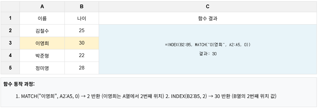 이렇게 하면 결과값으로 30이 나오게 되는데요, 이게 어떻게 동작하는 건지 궁금하시죠? 먼저 MATCH 함수가 "이영희"의 위치를 찾아주고, 그다음 INDEX 함수가 그 위치에 해당하는 나이 정보를 가져오는 거예요.